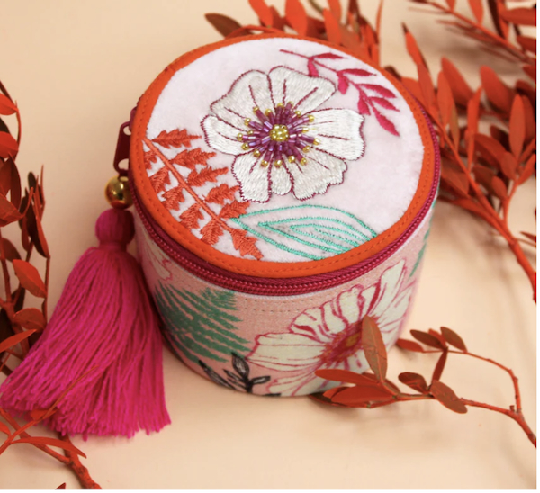Rundes Schmuckkästchen aus Samt mit besticktem Blumenmotiv